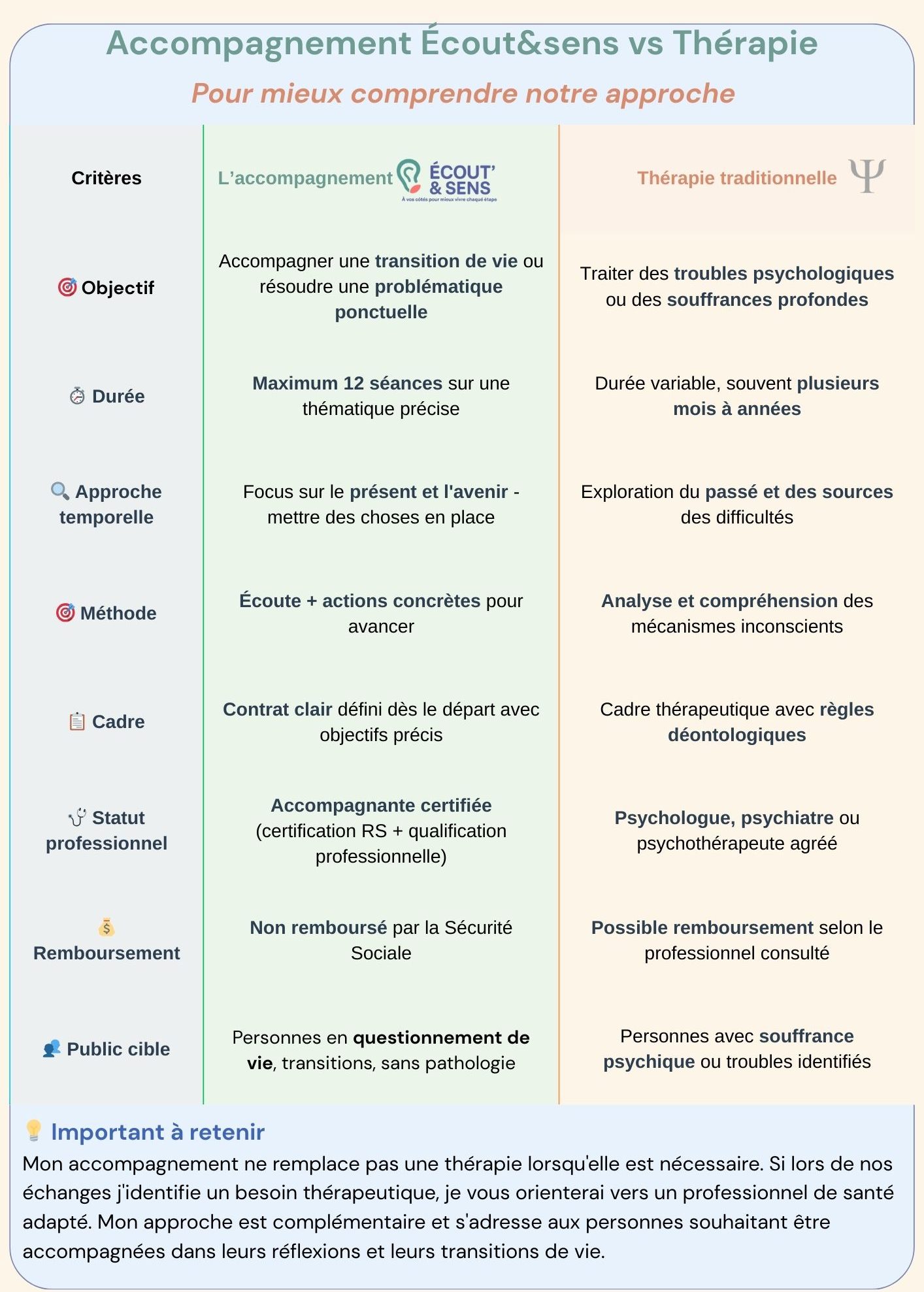 Il ne s'agit pas de thérapie, mais d'un accompagnement, centré sur vos besoins et votre réalité qutidienne.