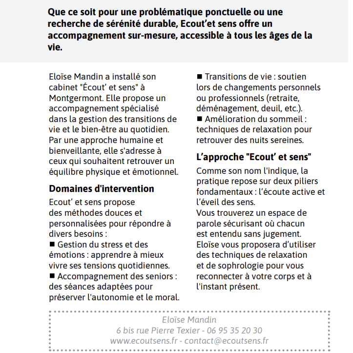 Le Journal de la Motte consacre un article à Ecout'&Sens, nouvelle activité d'accompagnement des seniors et aidants familiaux installée à Montgermont.